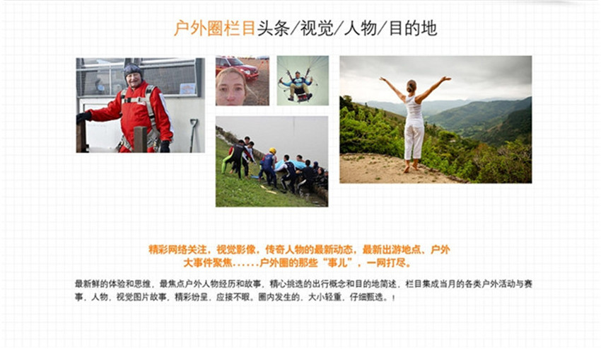 主要欄目:頭條、視覺(jué)、大玩家、發(fā)燒友、日記、目的地、裝備欄目、酷品、玩家推薦、體驗(yàn)解析、訓(xùn)練營(yíng)、特寫(xiě)、駕馭、寰宇地理、品牌裝備。戶外欄目—新鮮的體驗(yàn)和思維,焦點(diǎn)戶外人物,頭條:當(dāng)月網(wǎng)絡(luò)和其他平媒同步收集的新戶外資訊。