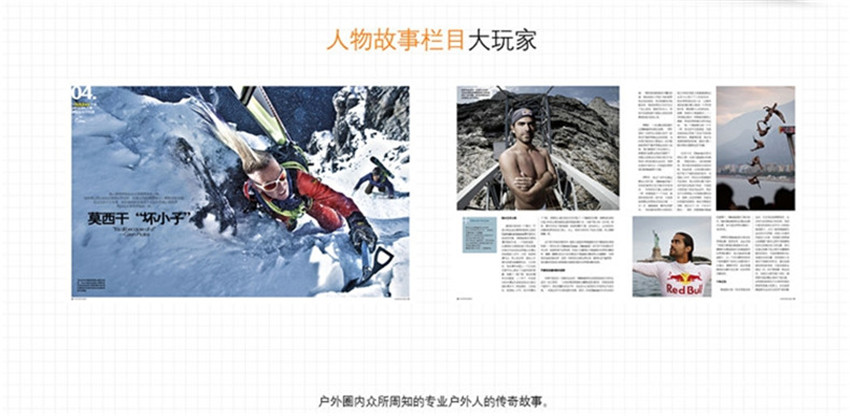 雜志以獨(dú)特的“玩家”視角和“興趣為先”的原則,把戶外“圈”中的一切,過(guò)濾掉那些復(fù)雜的技術(shù)點(diǎn)和繞口的專(zhuān)業(yè)術(shù)語(yǔ),以時(shí)尚、簡(jiǎn)單和直白的方式呈現(xiàn)給讀者新鮮的段子,新奇的玩法和炫酷的裝備,讓一個(gè)在普通不過(guò)的讀者,瞬間也能變成一個(gè)“戶外人”。