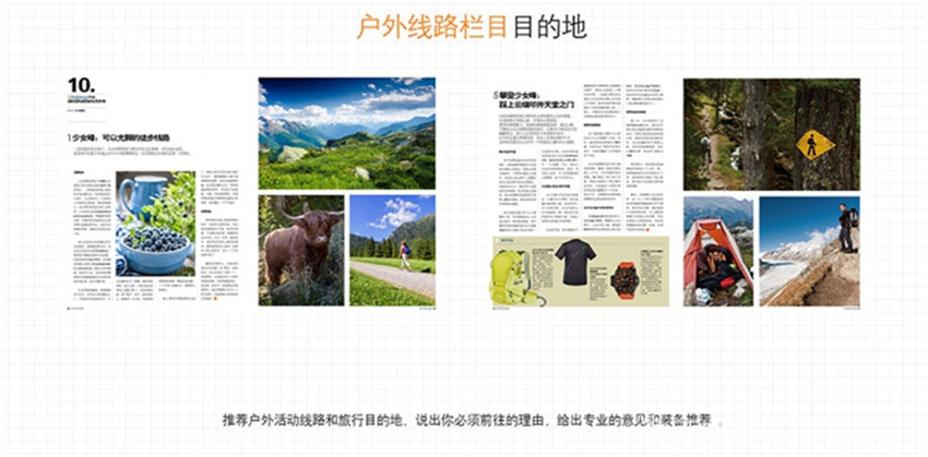 從多方位角度以專(zhuān)業(yè)態(tài)度結(jié)合時(shí)尚視角,將戶外運(yùn)動(dòng)與潮流消費(fèi)結(jié)合,讓?xiě)敉獬蔀槌鞘芯⒆x者生活和消費(fèi)方式的一部分;日記:資深戶外人的心路歷程和感知感言,分享他們的體驗(yàn),感動(dòng)所有,目的地:推薦戶外活動(dòng)線路和旅行目的地,說(shuō)出你必須前往的理由,給出專(zhuān)業(yè)的意見(jiàn)和裝備推薦。