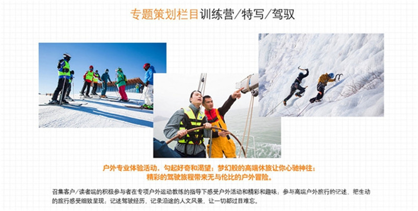 策劃?rùn)谀浚簯敉鈱?zhuān)業(yè)體驗(yàn)活動(dòng),勾起好奇和渴望,夢(mèng)幻般的高端休旅讓你心馳神往,精彩的駕駛綠城帶來(lái)無(wú)與倫比的戶外冒險(xiǎn)。視覺(jué):當(dāng)月或相關(guān)戶外主題及事件的選取圖片,講述背后的故事和精彩的旅途感受,大玩家:戶外圈內(nèi)眾所周知的專(zhuān)業(yè)戶外人的傳奇故事,發(fā)燒友:收集業(yè)余時(shí)尚玩家的奇聞糗事,看熱鬧,更看熱情。