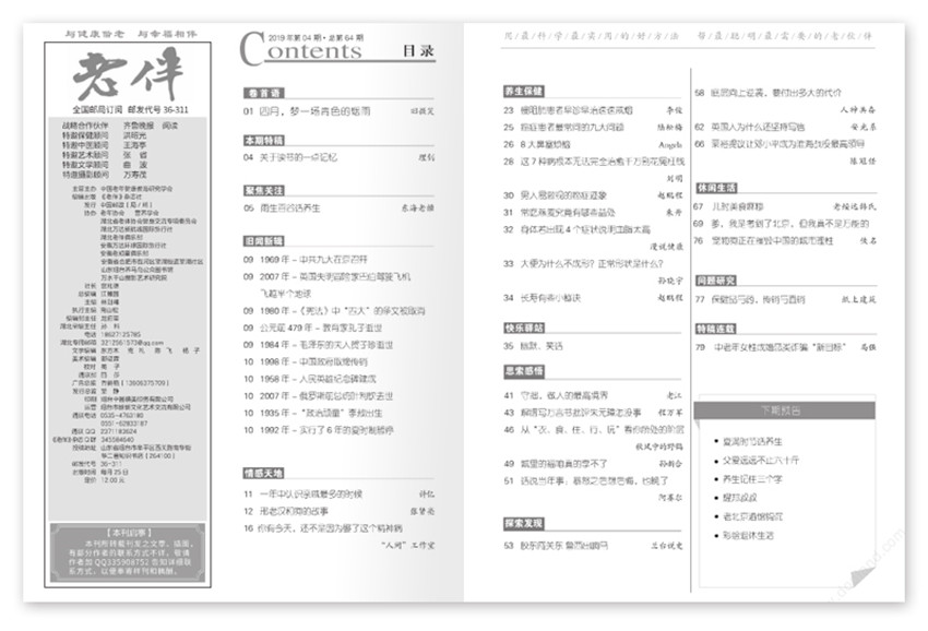 《老伴》雜志以全心全意為老年讀者服務(wù)為宗旨,以老年群體中的知識(shí)分子為對(duì)象,以思老年人所思,想老年人所想為特點(diǎn),以精心選載國(guó)內(nèi)外與老年人息息相關(guān)相關(guān)的各類文章為方法,以憂老年人之憂,樂(lè)老年人之樂(lè),議老人之事,答老人之問(wèn),解老人之惑,增老人之智,健老人之體,養(yǎng)老人之身,長(zhǎng)老人之壽,感老人之情,嘆老人之遇,喜老人之趣,愛(ài)老人之親,醫(yī)老人之病,幫老人之忙等為內(nèi)容,以“老年人離不開(kāi)的知心伴侶”為追求,傾力打造的中國(guó)老年人品牌雜志。