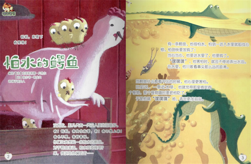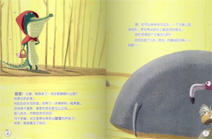 噓噓!注意,鱷魚來(lái)了!他在那里做什么呢?他要去奶奶家,他奶奶住在河對(duì)面,他帶了一塊薄餅和一瓶果醬。這些都不重要,重要的是他要怎么過(guò)河。那兒有水,而鱷魚是怕水的!可不是嘛,他又要害怕得弄出噗噗的聲音了!突然,鱷魚看見了巖石!