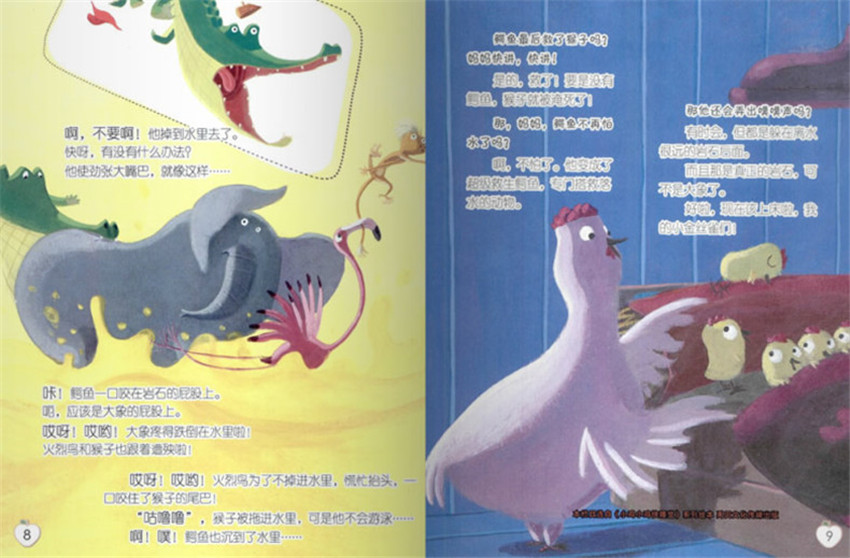 咔!鱷魚一口咬在巖石的屁股上。呃,應(yīng)該是大象的屁股上。哎呀!哎喲!大象疼得跌倒在水里啦!火烈鳥和猴子也跟著遭殃啦!哎呀!哎喲!火烈鳥為了不掉進(jìn)水里,慌忙抬頭,一口咬住了猴子的尾巴!“咕嚕嚕’,猴子被拖進(jìn)水里,可是他不會(huì)游泳...啊!噗!鱷魚也沉到了水里....