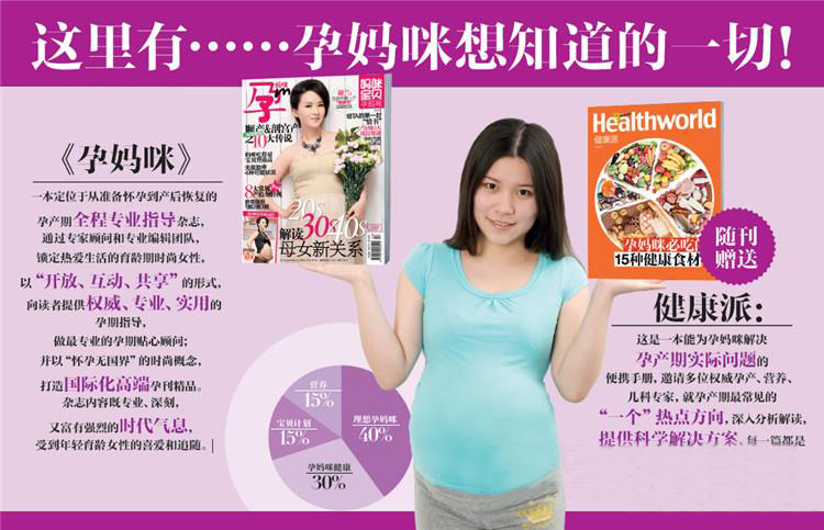 《孕媽咪》雜志鎖定熱愛生活的育齡期時尚女性,以“開放、互動、共享”的形式,向讀者提供、專業(yè)、實用的孕期指導(dǎo),做最專業(yè)的孕期貼心顧問;并以“懷孕無國界”的時尚概念,打造國際化高端孕刊精品。雜志內(nèi)容既專業(yè)、深刻,又富有強烈的時代氣息,受到年輕育齡女性的喜愛和追隨。