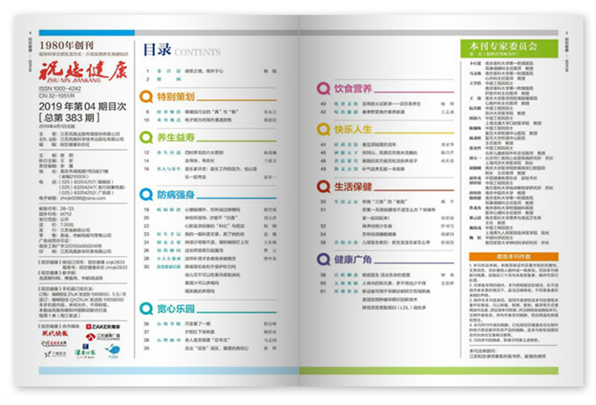 《祝您健康》(月刊)創(chuàng)刊于1980年,多年來雜志內(nèi)容及形式方面與時俱進,并以其形式和內(nèi)容的豐富性及多樣性,贏得了不同階層讀者的喜愛與擁護。江蘇鳳凰科學(xué)技術(shù)出版社有限公司(江蘇科學(xué)技術(shù)出版社)成立于1978年,是全國優(yōu)秀出版社、國家一級出版社,獲“全國百佳圖書出版單位”“全國新聞出版系統(tǒng)先進集體”等多項國家和省部級榮譽稱號。